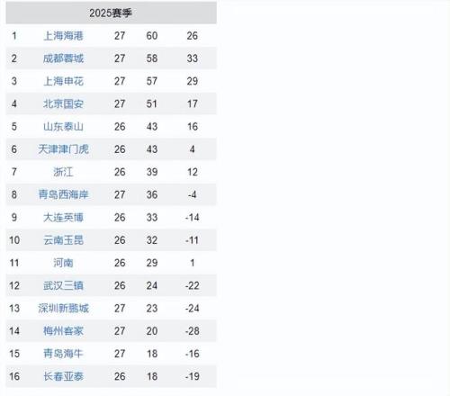 随着国安12新鹏城,退出争冠行列!中超最新积分榜:降级3选2